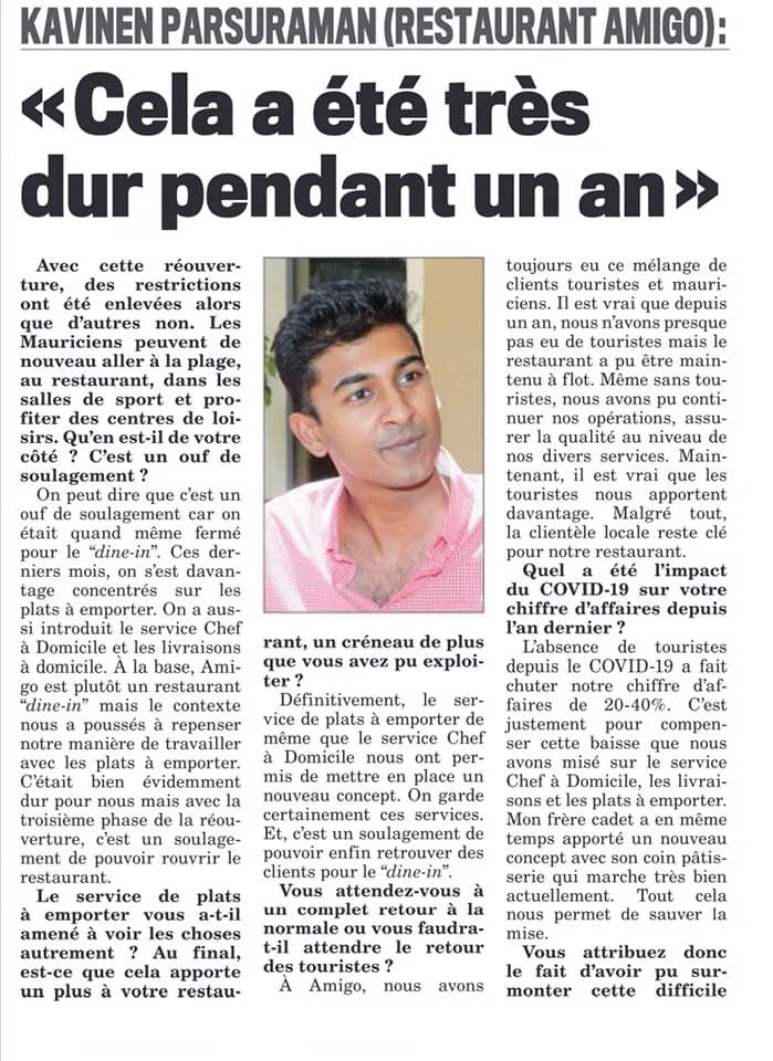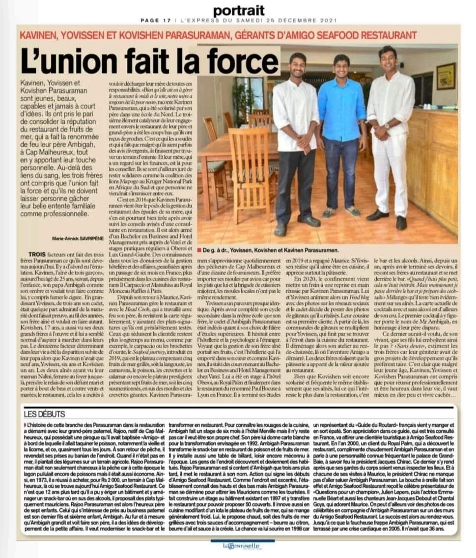 Il est à la tête d’un business familial vieux de 32 ans. Du haut de ses 20 ans, Kavinen Parasuraman est un vrai gestionnaire. C’est avec beaucoup de courage et de détermination qu’il a fait le choix, il y a un peu plus d’un an, de reprendre la direction du restaurant Amigo, à Cap-Malheureux…