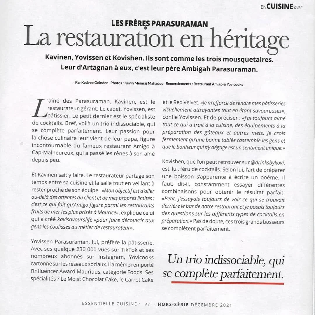 Lorsqu’en 2005 il perd son père, Kavinen Parasuraman n’a que neuf ans et ses frères un et six ans. Amigo est alors un restaurant coté ayant accueilli notamment des personnalités françaises comme Jacques Chirac, Chantal Goya, Julien Lepers et Emmanuelle Béart…..